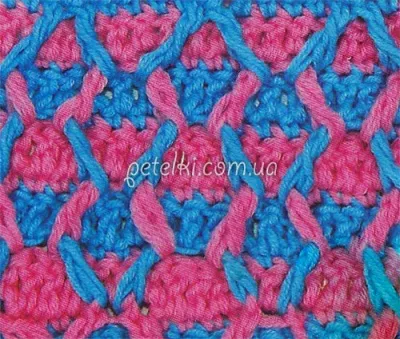 Cast on a chain from 24 sp (4 patterns) + 8 sts for symmetry + 1 sp increase. Crochet due to the scheme. If the row starts with 3 sp increase, which corresponds to 1 BP dc, so finish with BP sc. Repeat the 3rd and 4th rows, rotating the colors of yarn.
