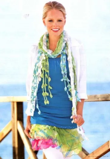The length of the fringe is determined by the quantity of chain stitches in front of the 1st leaf or the quantity of leaves inside the fringe. Join to the end of the scarf with the help of 1 slip stitch and make 4 or 10 chain stitches, then work according to Scheme 2. First, make 10 chain stitches for the 1st leaf, 1 slip stitch in the 1st chain stitch, and 16 chain stitches; finish with 10 chain stitches for the 1st leaf. Join with 1 slip stitch to the 1st chain stitch of the leaf, turn and fasten loops of chain stitches for leaves according to the scheme. Repeat the pattern once or twice.