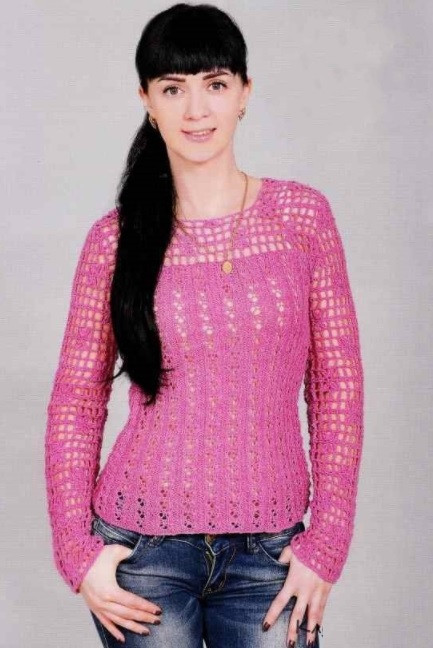 Cast on 96 sts and work with the main pattern according to scheme 1. Crochet straight. At 35 cm height, bind off 3 sts from both sides for arm-holes and bind off 2 x 1 st, 3 x 1 st. At 43 cm height, bind off all the sts.
