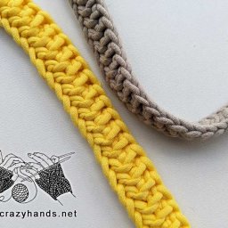 Cast on 10 sts with another color of yarn and make a "cable": 8 rows with stockinette stitch, 9th row: 4 x 4 crossing, knit as usual, slip the 1st st, the last st as purl. Then, the 10th row - all purl sts. Then, repeat the ornament. The length of "cable" is the same as the width of your case (19 cm). Make 2 same "cables".