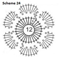 Work on separate patterns: flowers (schemes 24, 24a), leaves, and leaves on sticks. Arrange the ready-made elements on your pattern design with the upper wrong side facing up, creating your unique composition. Fix them with pins. Connect the flowers with a net pattern around.