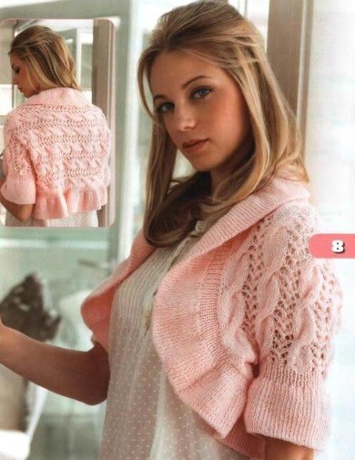 7th row: cross 8 stitches to the right (leave 4 stitches on the auxiliary needle behind work, 4 knit stitches, 4 knit stitches from the auxiliary needle), 1 knit stitch, 1 yarn over, double broaching, 1 yarn over, 1 knit stitch; repeat from * to *, cross 8 stitches to the right;
