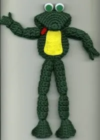 With a tapestry needle and length of yarn, attach arms and legs to body according to picture. Cut out a small shape from yellow felt for the front of the tummy area; it doesn't have to be perfect. Glue to front of frog's chest. Cut out a tongue from red felt. Glue in mouth, then glue mouth down. Glue on wiggle eyes. Glue magnet to back. If you want a more "compact" frog, fold legs up with knees to chin and wrap arms around legs, glue or tack in place.