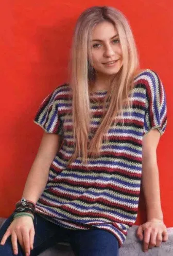 Make shoulder and side seams. Fasten the neck-hole and armholes with 1 row of single crochets with light-green yarn.